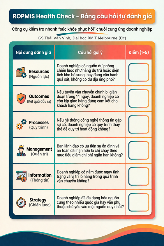Nhìn từ góc độ thực tiễn, giá trị của ROPMIS Health Check nằm ở chỗ doanh nghiệp không cần chờ đến khi có hệ thống quản trị phức tạp mới bắt đầu đánh giá rủi ro. Chỉ cần tự soi lại 6 khía cạnh then chốt này, doanh nghiệp đã có thể nhận diện những điểm yếu dễ tổn thương nhất trong chuỗi cung ứng của mình để ưu tiên xử lý. Đây là cách tiếp cận phù hợp không chỉ với các tập đoàn lớn mà cả với doanh nghiệp vừa và nhỏ, vốn thường chịu tác động mạnh hơn khi xảy ra biến động kéo dài.