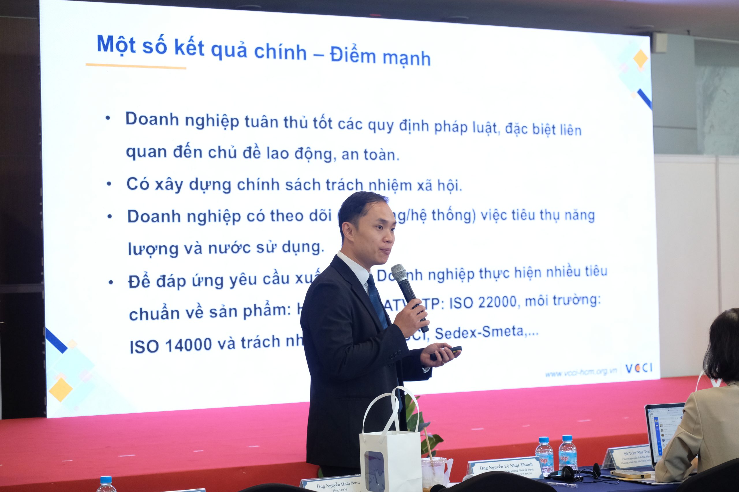 Ông Nguyễn Lê Nhật Thanh – Phó Trưởng phòng, Văn phòng Giới sử dụng lao động & Doanh nhân nữ, VCCI-HCM mang đến những kết quả khảo sát thực tiễn tại các doanh nghiệp thủy sản xuất khẩu, đồng thời chỉ ra các khoảng trống năng lực về ESG.