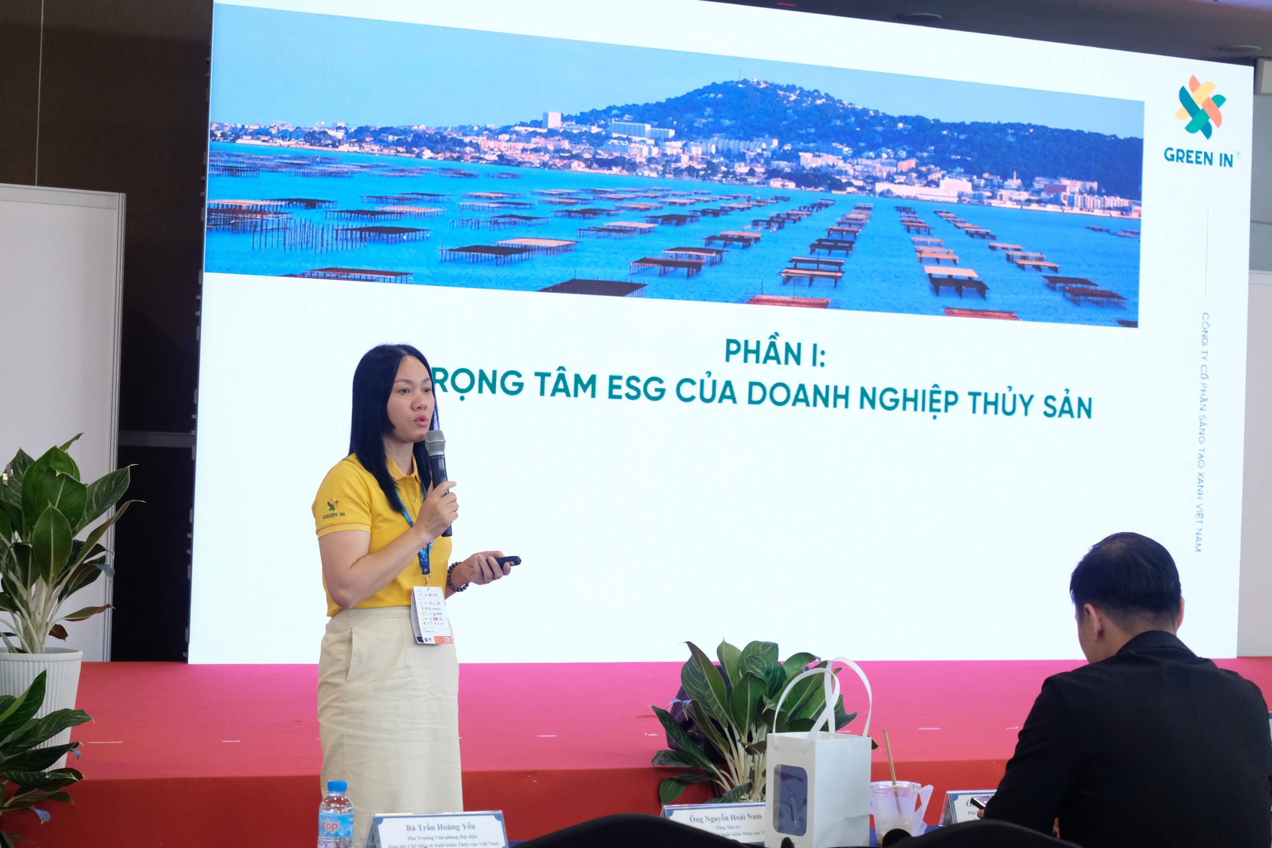 Bà Ngụy Thị Giang – Chủ tịch Hội đồng Quản trị GREEN IN, chia sẻ về việc xác định các chủ đề ESG trọng yếu đối với doanh nghiệp thủy sản – giúp doanh nghiệp nhận diện rõ ưu tiên để hành động hiệu quả.