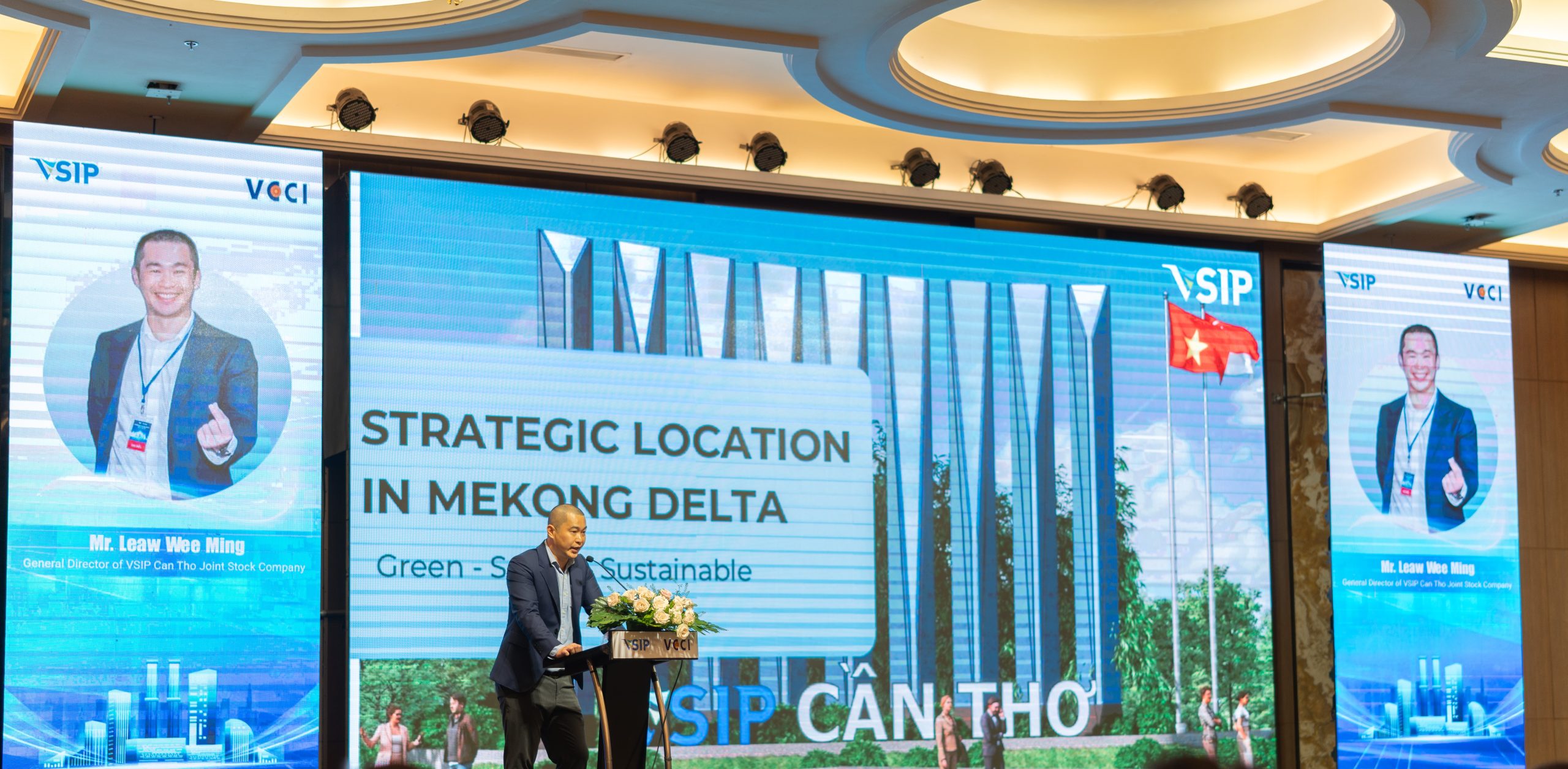 Ông Leaw Wee Ming, Tổng Giám đốc VSIP Cần Thơ, khẳng định việc lựa chọn Tp. Cần Thơ để phát triển dự án VSIP thứ 13 xuất phát từ lợi thế chiến lược của Thành phố và sự đồng thuận trong tầm nhìn phát triển bền vững. Ông nhấn mạnh Thành phố không chỉ giữ vị trí trung tâm kết nối vùng nhờ hệ thống cao tốc, cảng sông và sân bay quốc tế, mà còn nổi lên như trung tâm logistics, chuỗi cung ứng và cửa ngõ ra thị trường toàn cầu. Bên cạnh đó, thành phố có lực lượng lao động dồi dào, hơn 3,2 triệu dân cùng 37 trường đại học, cao đẳng, trở thành trung tâm đào tạo nguồn nhân lực chất lượng cao cho các ngành công nghiệp tương lai.