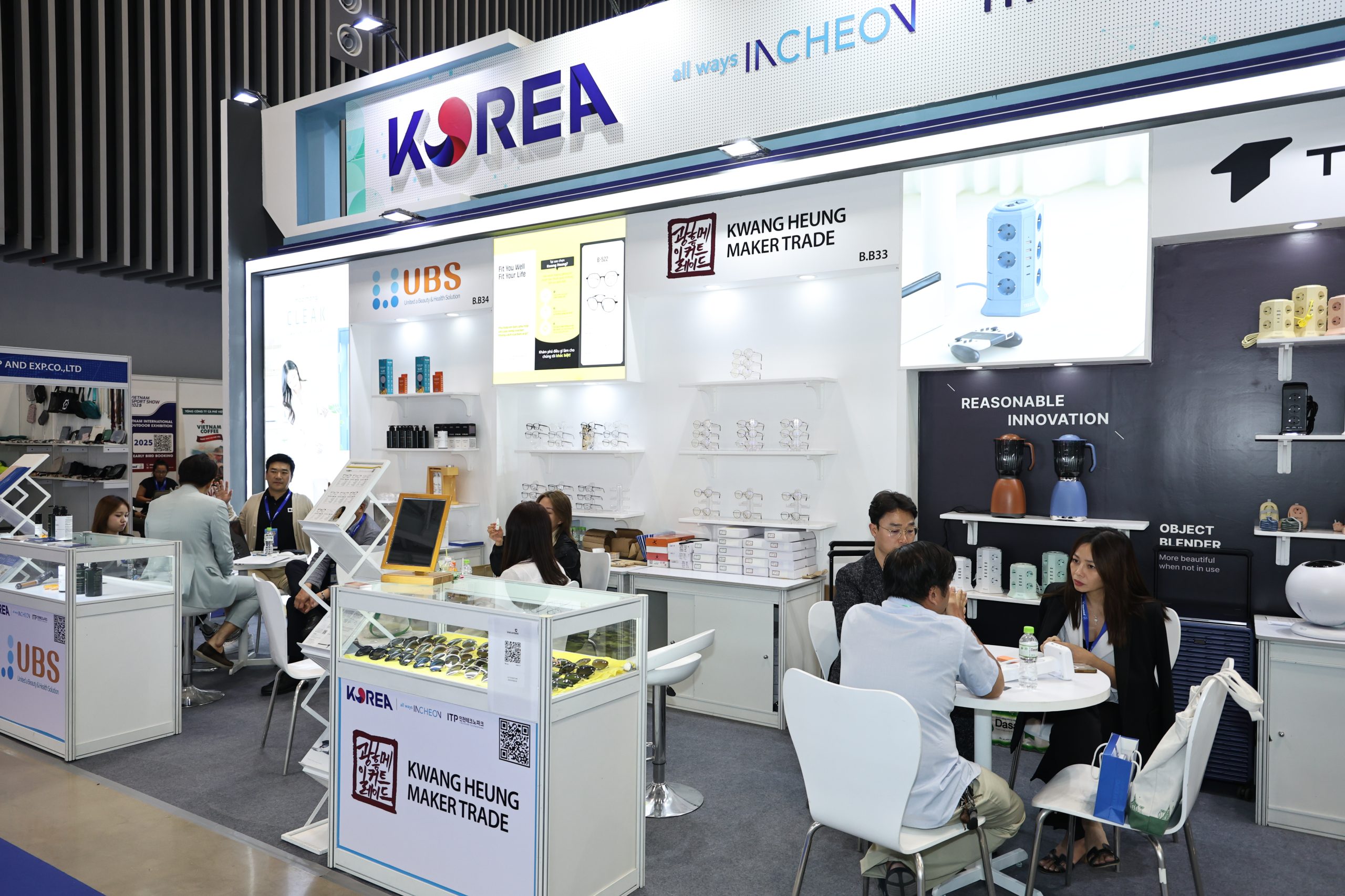 Khu Gian hàng Hàn Quốc – điểm hẹn quen thuộc của Vietnam Expo tiếp tục đón nhận sự tham gia của hàng chục doanh nghiệp thuộc các lĩnh vực mỹ phẩm, F&B, đồ gia dụng, thiết bị điện tử, chăm sóc sức khỏe và thể thao. Gian hàng được thiết kế chuyên nghiệp, mang phong cách hiện đại, là minh chứng cho mối quan hệ hợp tác kinh tế sâu sắc và năng động giữa Việt Nam và Hàn Quốc.