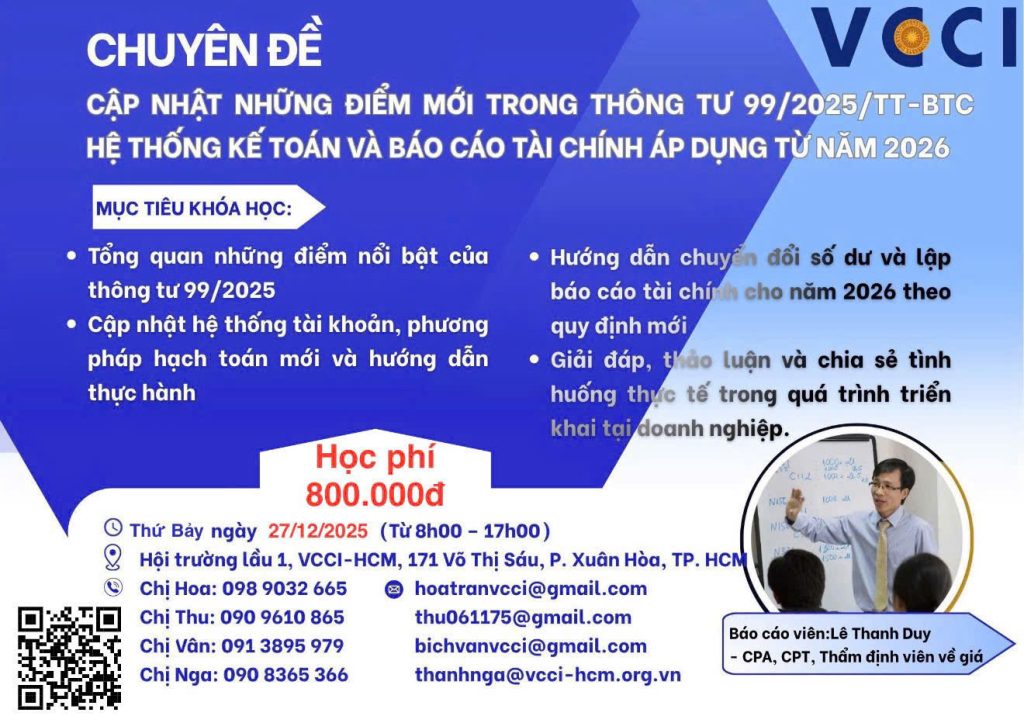 Ngày 27/10/2025, Bộ Tài chính ban hành Thông tư số 99/2025/TT-BTC (có hiệu lực thi hành kể từ ngày 01/01/2026) thay thế các Thông tư số 200/2014/TT-BTC ngày 22/12/2014, Thông tư số 75/2015/TT-BTC ngày 18/5/2015,… Nhằm giúp doanh nghiệp nắm bắt kịp thời các thay đổi quan trọng của Thông tư 99/2025/TT-BTC về chế độ kế toán doanh nghiệp và chuẩn bị tốt cho việc chuyển đổi số dư, lập báo cáo tài chính theo quy định mới từ năm 2026, Liên đoàn Thương mại và Công nghiệp Việt Nam – Chi nhánh khu vực TP. Hồ Chí Minh (VCCI-HCM) tổ chức khóa đào tạo: