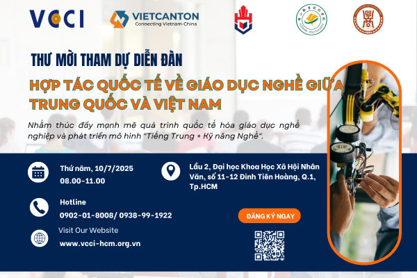 Bạn đang tìm kiếm cơ hội nâng cao chất lượng nguồn nhân lực cho doanh nghiệp hay phát triển kỹ năng cho bản thân? Đừng bỏ lỡ diễn đàn đặc biệt này được Liên đoàn Thương mại và Công Nghiệp Việt Nam – Chi nhánh khu vực Tp. HCM (VCCI-HCM) phối hợp cùng Học viện Kỹ thuật Phật Sơn, Tổng hội Thương mại Trung Quốc tại Việt Nam – Hiệp hội Doanh nghiệp Quảng Đông và Trường Đại học Hùng Vương Tp.HCM phối hợp tổ chức: