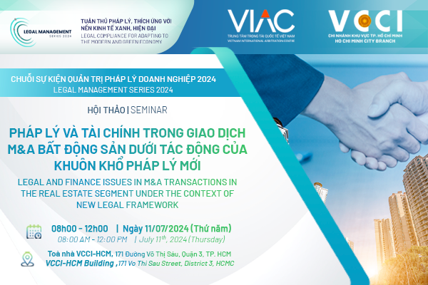 Liên quan tới vấn đề về tài chính và pháp lý phát sinh trong giao dịch M&A, đặc biệt là khi đặt trong bối cảnh thay đổi quy định pháp luật như trên, Liên đoàn Thương mại và Công nghiệp Việt Nam – Chi nhánh khu vực TP. Hồ Chí Minh (VCCI-HCM) cùng với Trung tâm Trọng tài Quốc tế Việt Nam (VIAC) phối hợp tổ chức Hội thảo “Pháp lý và Tài chính trong giao dich M&A Bất động sản dưới tác động của khuôn khổ pháp lý mới”.