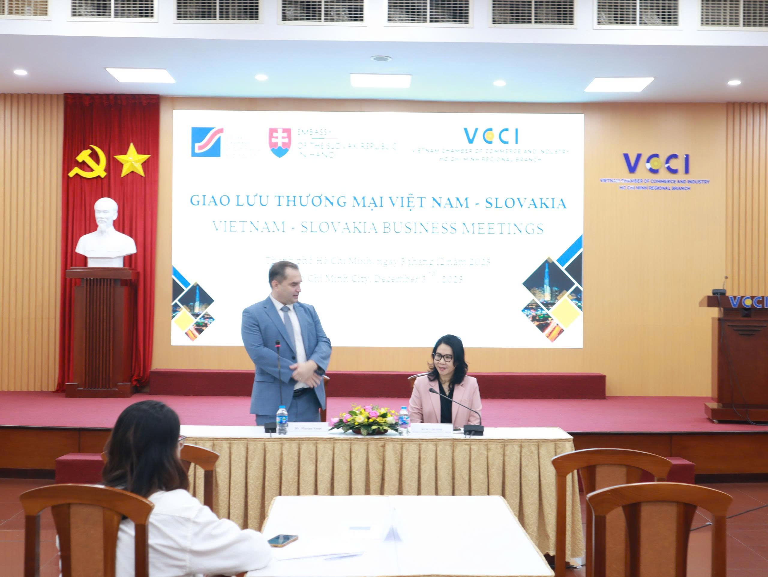Sáng ngày 03/12/2025, tại Hội trường thuộc trụ sở Liên đoàn Thương mại và Công nghiệp Việt Nam – Chi nhánh khu vực TP. Hồ Chí Minh (VCCI-HCM), VCCI-HCM đã phối hợp với Đại sứ quán Slovakia tổ chức buổi Giao lưu thương mại với đoàn doanh nghiệp Slovakia nhằm tăng cường quan hệ hợp tác thương mại giữa hai nước.